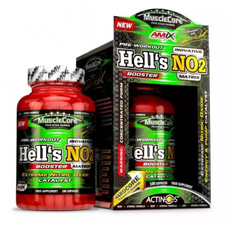 El Pre-entreno Hell's NO2 de Amix MuscleCore es un producto para tomar antes de un entrenamiento que contiene que contiene ActiNOS™ en combinación con L-arginina alfa-cetoglutarato, Beta-Alanina (CarnoSyn®), ALA, Cafeína, Zinc, vitaminas B6 y vitaminas B12